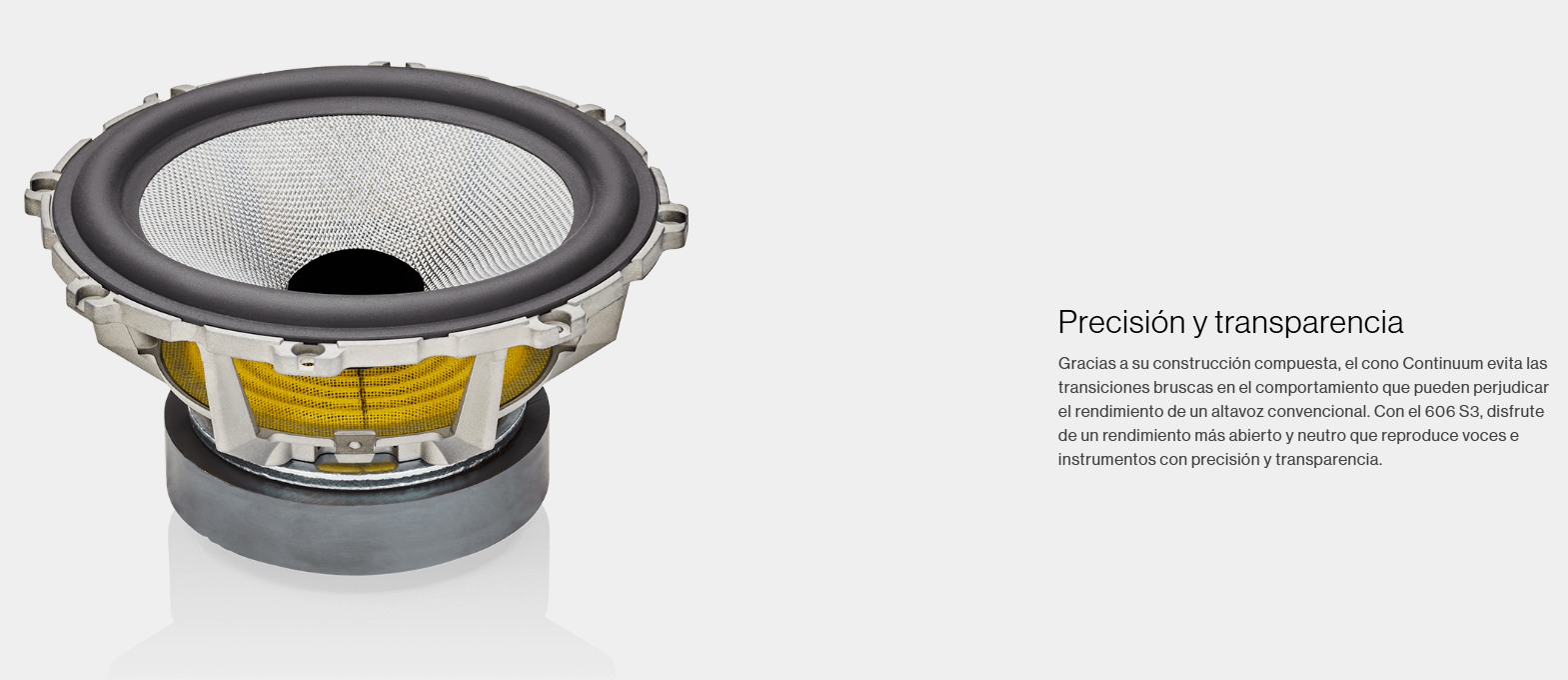 Gracias a su construcción compuesta, el cono Continuum evita las transiciones bruscas en el comportamiento que pueden perjudicar el rendimiento de un altavoz convencional. Con el 606 S3, disfrute de un rendimiento más abierto y neutro que reproduce voces e instrumentos con precisión y transparencia.