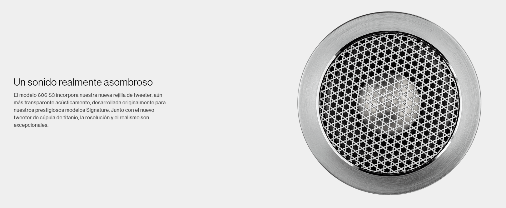 El modelo 606 S3 incorpora nuestra nueva rejilla de tweeter, aún más transparente acústicamente, desarrollada originalmente para nuestros prestigiosos modelos Signature. Junto con el nuevo tweeter de cúpula de titanio, la resolución y el realismo son excepcionales.