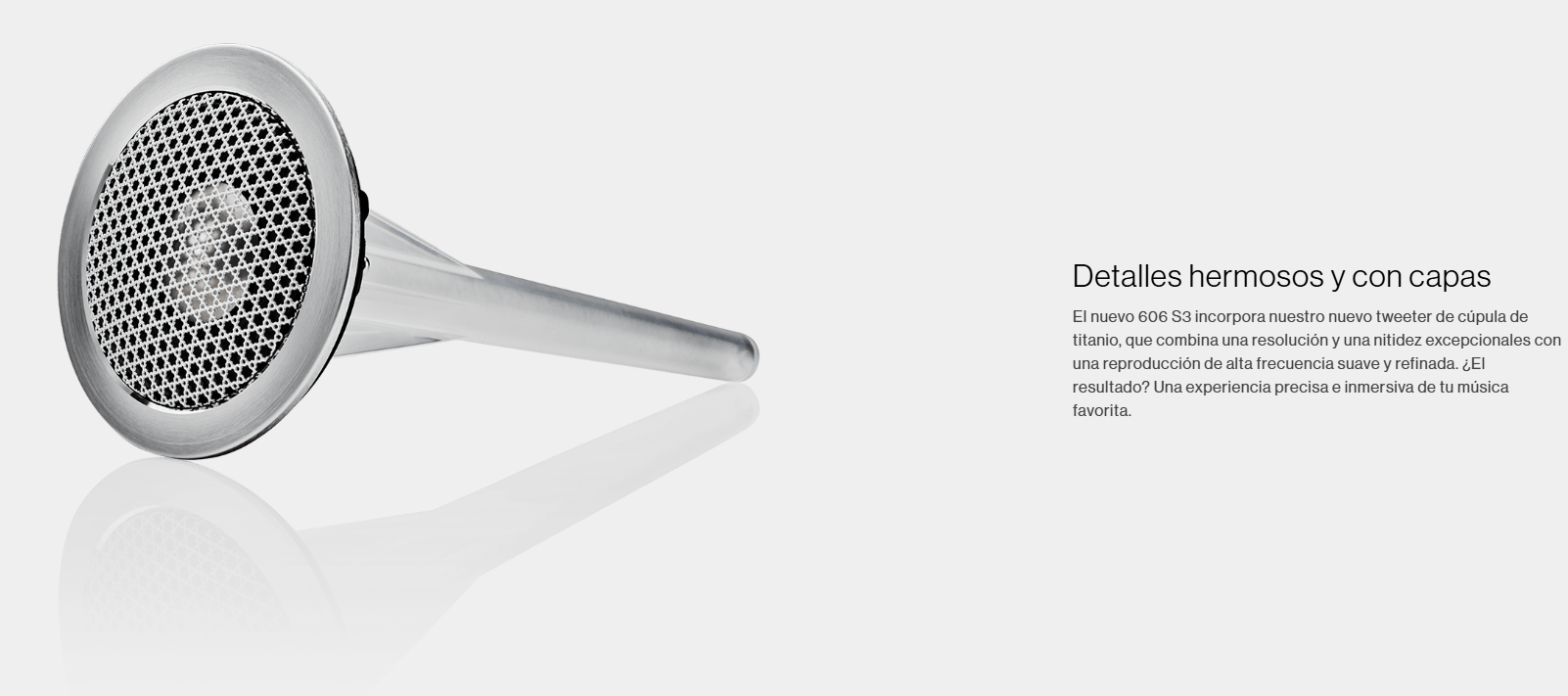 El nuevo 606 S3 incorpora nuestro nuevo tweeter de cúpula de titanio, que combina una resolución y una nitidez excepcionales con una reproducción de alta frecuencia suave y refinada. ¿El resultado? Una experiencia precisa e inmersiva de tu música favorita.