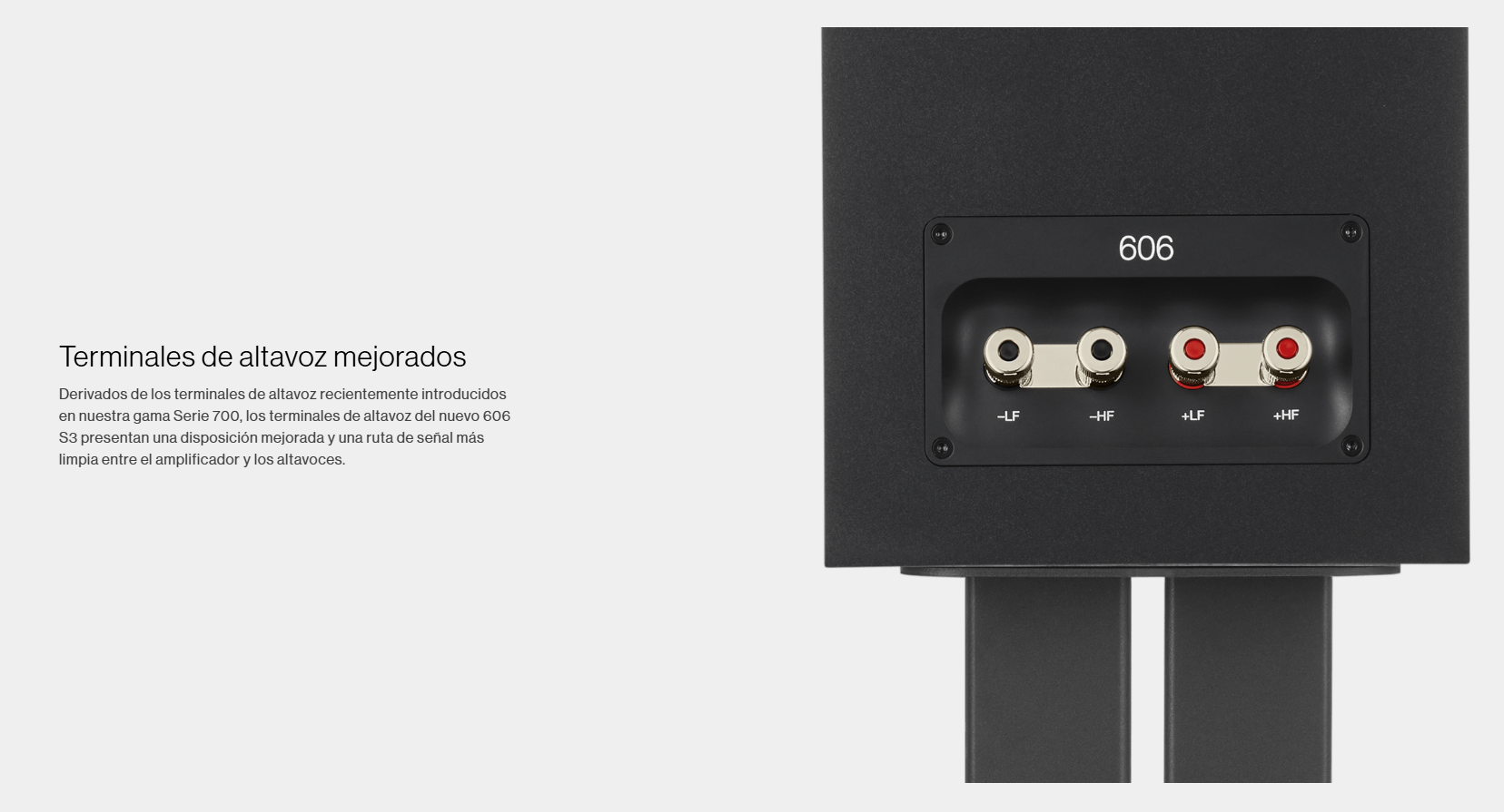 Derivados de los terminales de altavoz recientemente introducidos en nuestra gama Serie 700, los terminales de altavoz del nuevo 606 S3 presentan una disposición mejorada y una ruta de señal más limpia entre el amplificador y los altavoces.