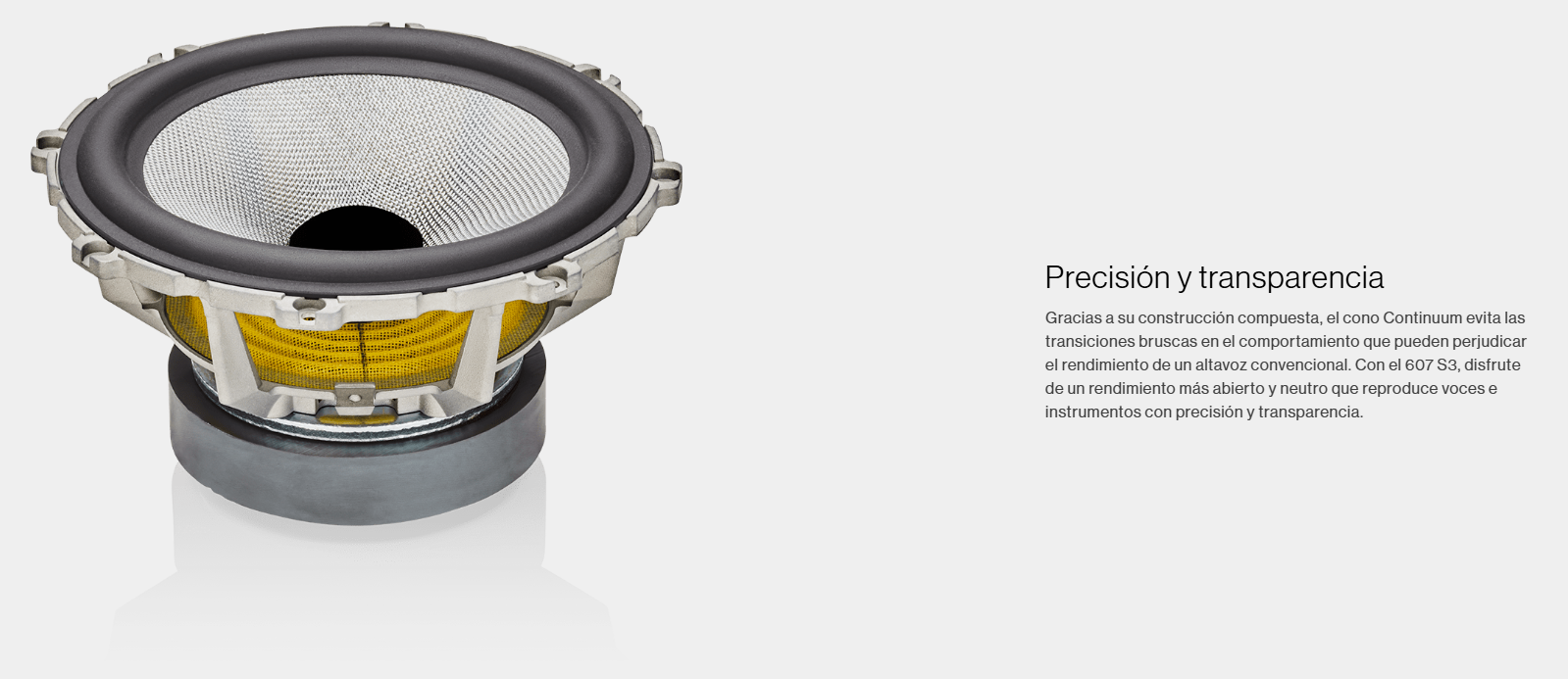 Gracias a su construcción compuesta, el cono Continuum evita las transiciones bruscas en el comportamiento que pueden perjudicar el rendimiento de un altavoz convencional. Con el 607 S3, disfrute de un rendimiento más abierto y neutro que reproduce voces e instrumentos con precisión y transparencia.