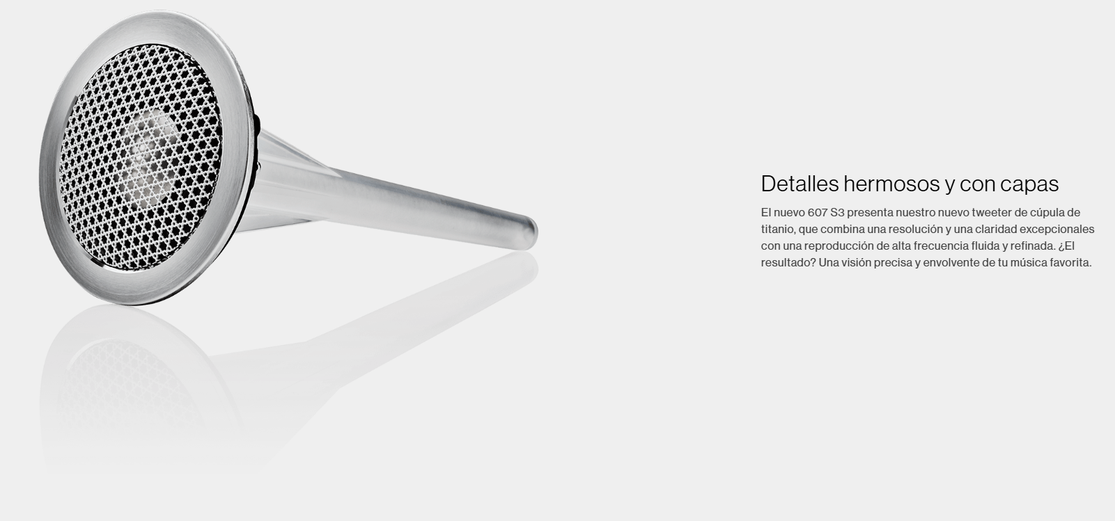 El nuevo 607 S3 presenta nuestro nuevo tweeter de cúpula de titanio, que combina una resolución y una claridad excepcionales con una reproducción de alta frecuencia fluida y refinada. ¿El resultado? Una visión precisa y envolvente de tu música favorita.