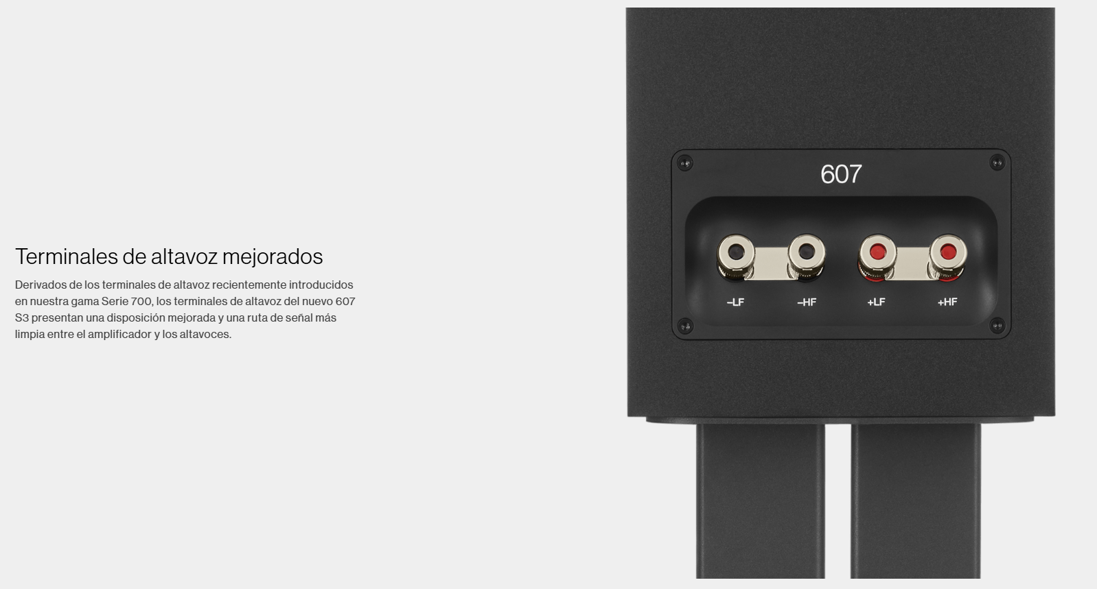 Derivados de los terminales de altavoz recientemente introducidos en nuestra gama Serie 700, los terminales de altavoz del nuevo 607 S3 presentan una disposición mejorada y una ruta de señal más limpia entre el amplificador y los altavoces.