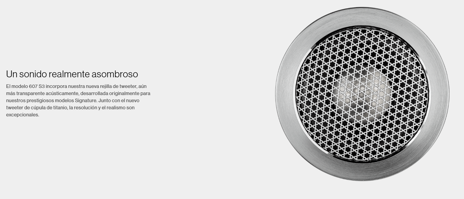 El modelo 607 S3 incorpora nuestra nueva rejilla de tweeter, aún más transparente acústicamente, desarrollada originalmente para nuestros prestigiosos modelos Signature. Junto con el nuevo tweeter de cúpula de titanio, la resolución y el realismo son excepcionales.