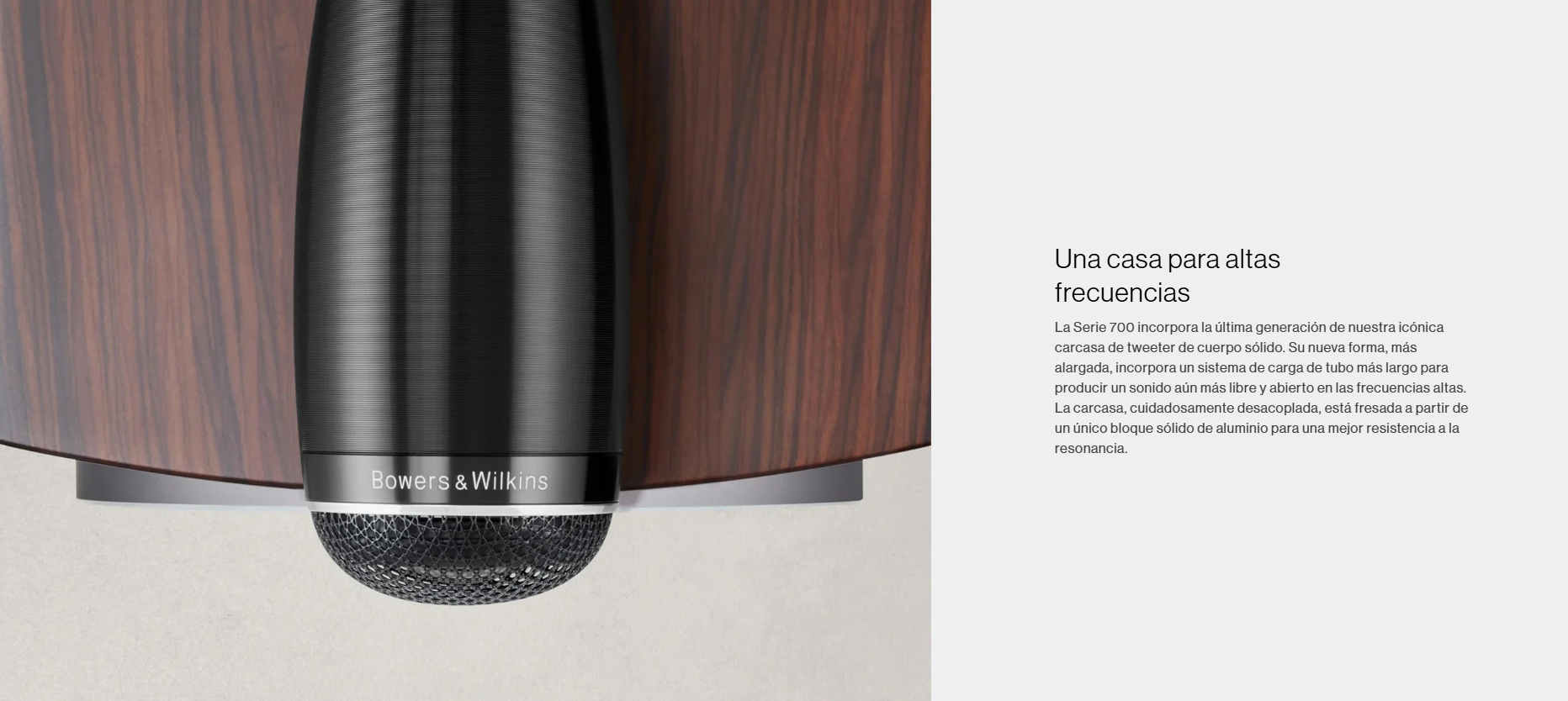 La Serie 700 incorpora la última generación de nuestra icónica carcasa de tweeter de cuerpo sólido. Su nueva forma, más alargada, incorpora un sistema de carga de tubo más largo para producir un sonido aún más libre y abierto en las frecuencias altas. La carcasa, cuidadosamente desacoplada, está fresada a partir de un único bloque sólido de aluminio para una mejor resistencia a la resonancia.