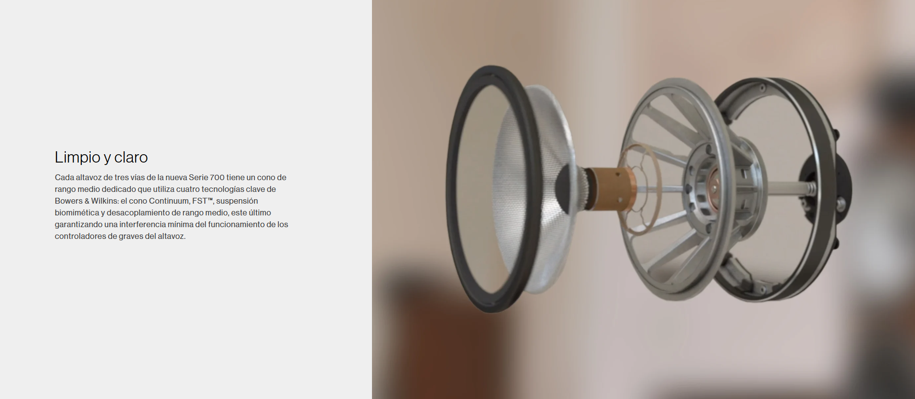Cada altavoz de tres vías de la nueva Serie 700 tiene un cono de rango medio dedicado que utiliza cuatro tecnologías clave de Bowers & Wilkins: el cono Continuum, FST™, suspensión biomimética y desacoplamiento de rango medio, este último garantizando una interferencia mínima del funcionamiento de los controladores de graves del altavoz.