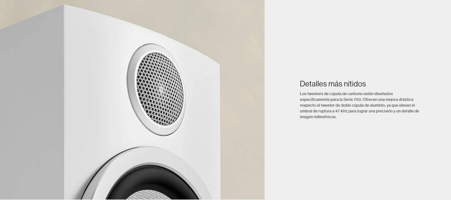 Los tweeters de cúpula de carbono están diseñados específicamente para la Serie 700. Ofrecen una mejora drástica respecto al tweeter de doble cúpula de aluminio, ya que elevan el umbral de ruptura a 47 kHz para lograr una precisión y un detalle de imagen milimétricos.