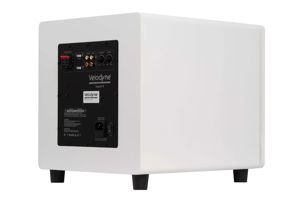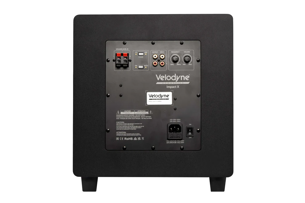 Los nuevos subwoofers Impact X están fabricados con MDF extragrueso para un rendimiento máximo sin resonancias, y sus patas de aislamiento de elastómero proporcionan una eficiente separación del suelo. Los subwoofers Impact X de Velodyne Acoustics se conectan fácilmente a sus dispositivos fuente mediante entradas RCA para los canales izquierdo y derecho, y las tomas de salida correspondientes permiten la conexión sin problemas de subwoofers adicionales. Mediante terminales de cable, también es posible integrar los altavoces de largo alcance de alta calidad en sistemas donde el amplificador o receptor AV no dispone de una salida RCA adecuada. Los subwoofers Impact X se activan automáticamente al detectar una señal, y el volumen, la frecuencia de cruce y la fase se pueden ajustar tanto en el panel trasero como mediante el control remoto incluido.